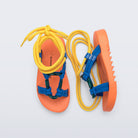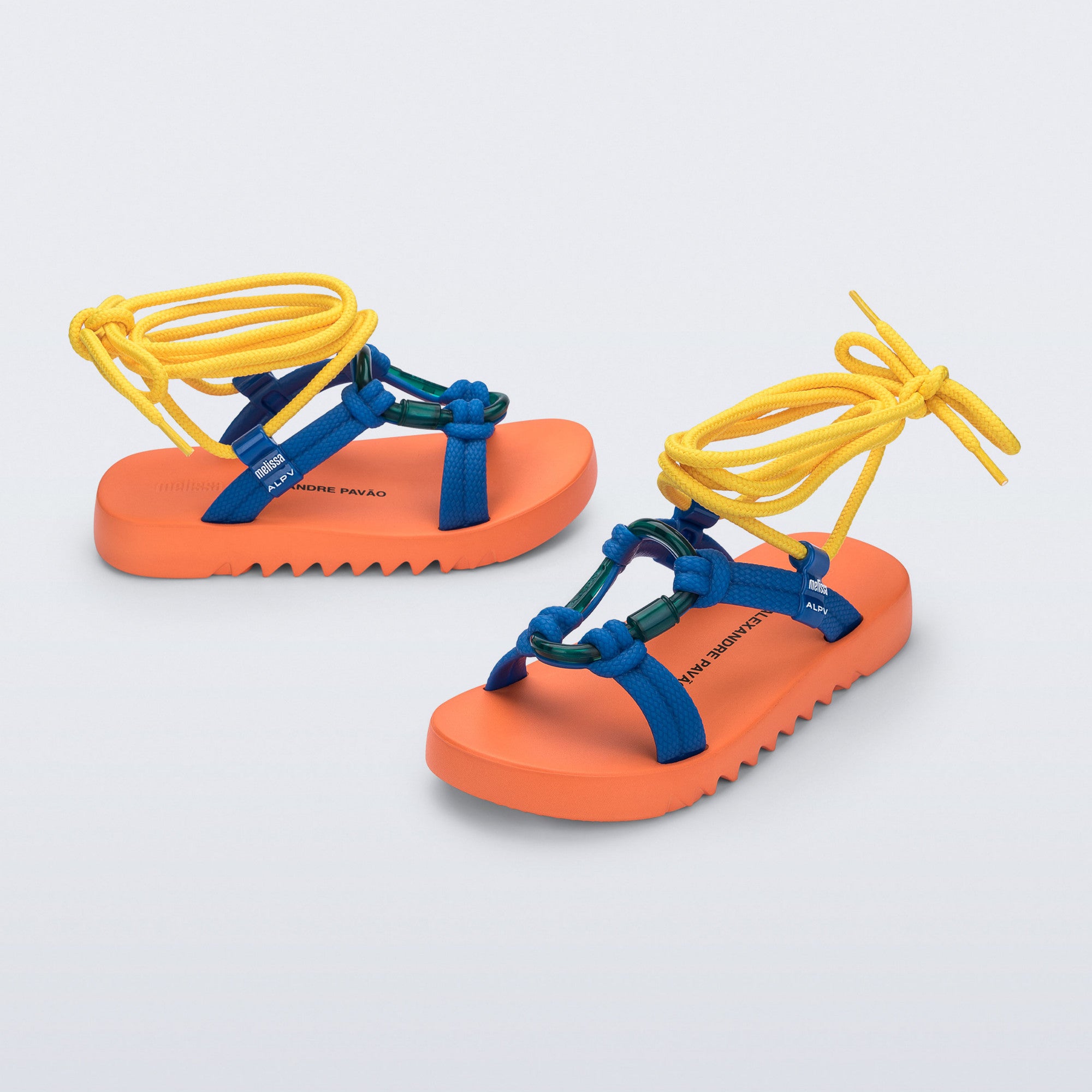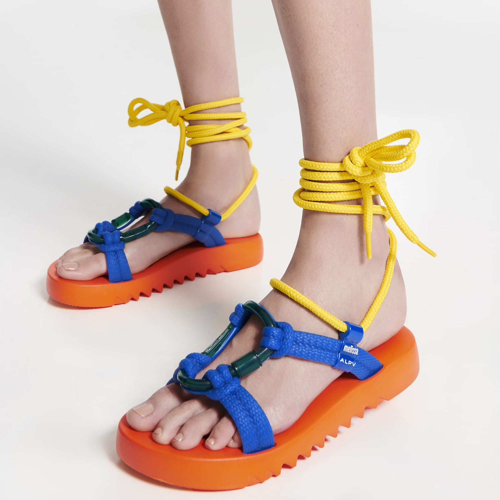 The Melissa Kirk, a collaboration between Melissa and Alexandre Pavão, brings the designer's striking aesthetic to an irreverent Melissa model. Inspired by utilitarian elements, the sandal explores the look of ropes and carabiners, iconic in Pavão's work. With a vibrant color palette and textile rope lacing, the launch balances personality and versatility, reaffirming the bold DNA of the partnership. Sole made of Bio EVA;