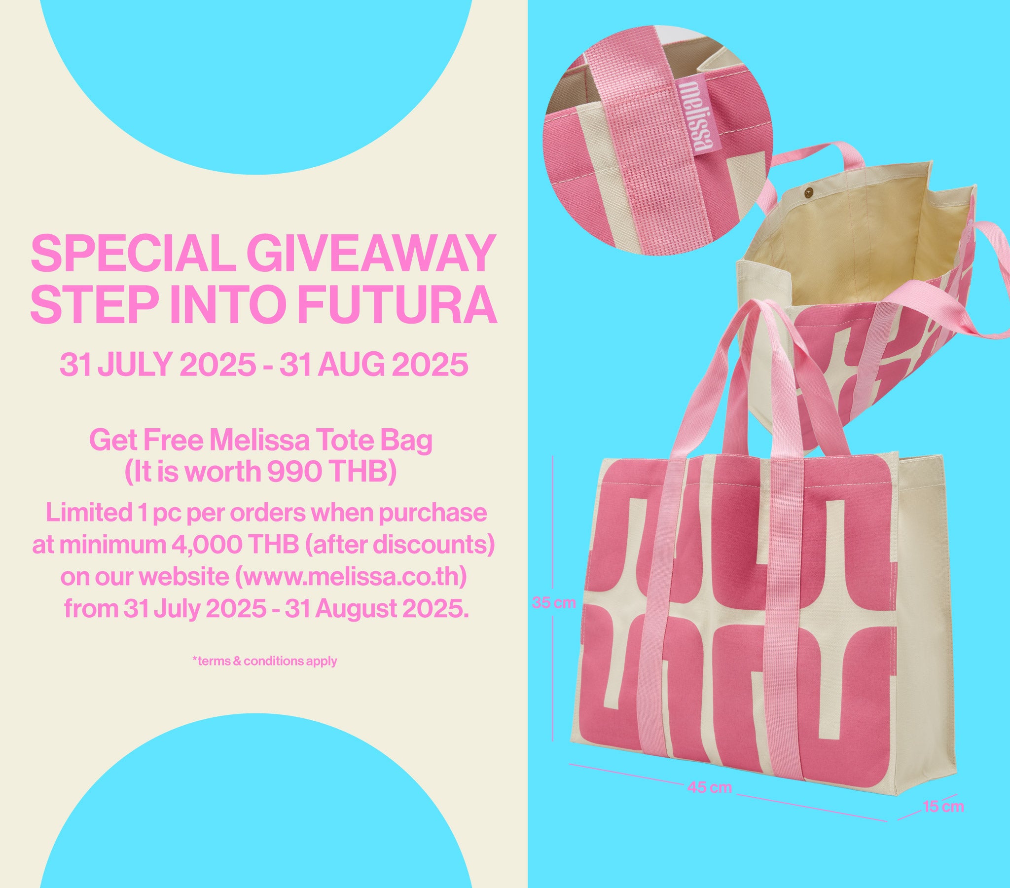 • First 150 orders get free Melissa Tote Bag valued 990 THB when purchase minimum 4,000 THB (after discounted)